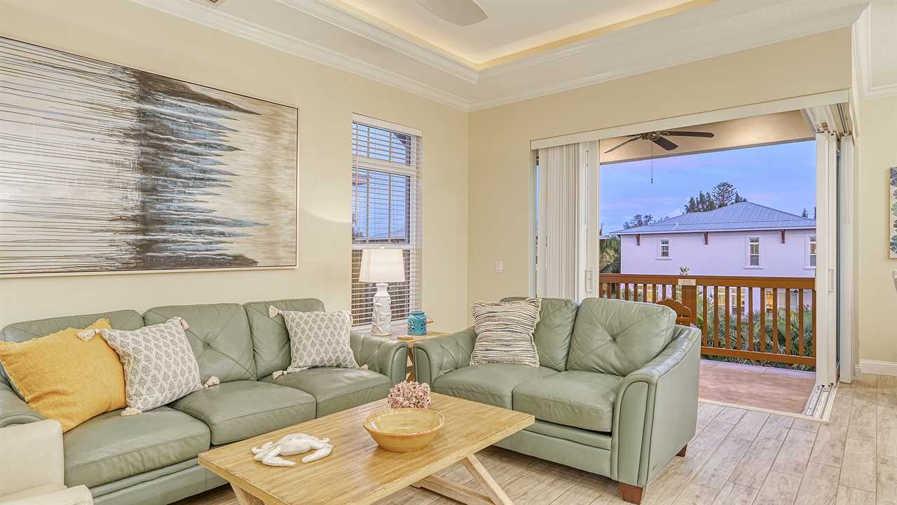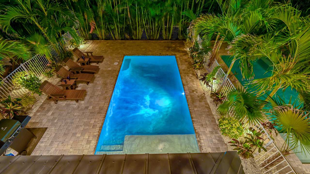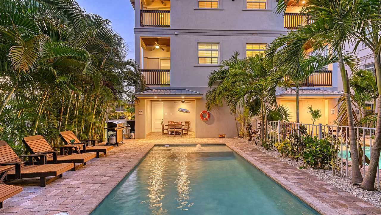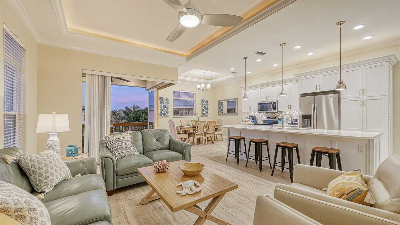 You ascend to your third-floor sanctuary, where the ceilings stretch high and the sunlight spills in through wide windows. The scent of salt air drifts through the balcony doors as you sip morning coffee above the palms. After a beach walk at Point of Rocks, your private pool and shaded cabana wait below. As the sky turns to coral at dusk, the kitchen becomes the hub for evening cooking, conversation, and laughter—all while your dog dozes nearby, completely at home.