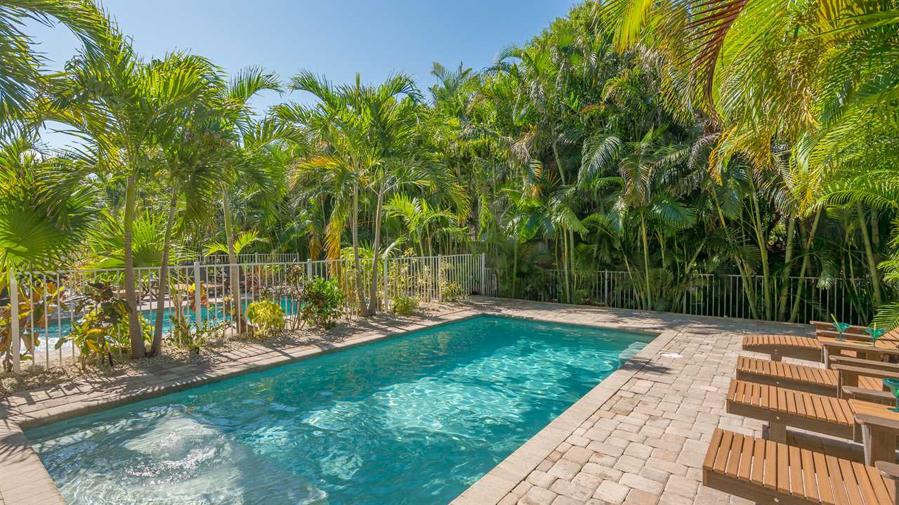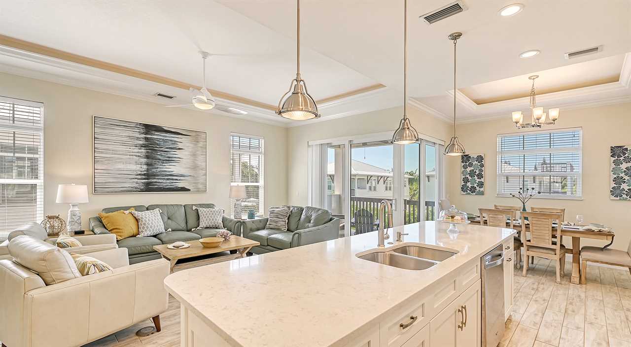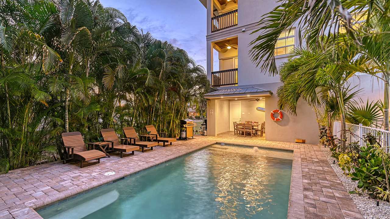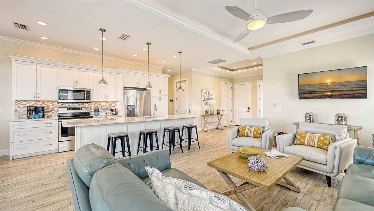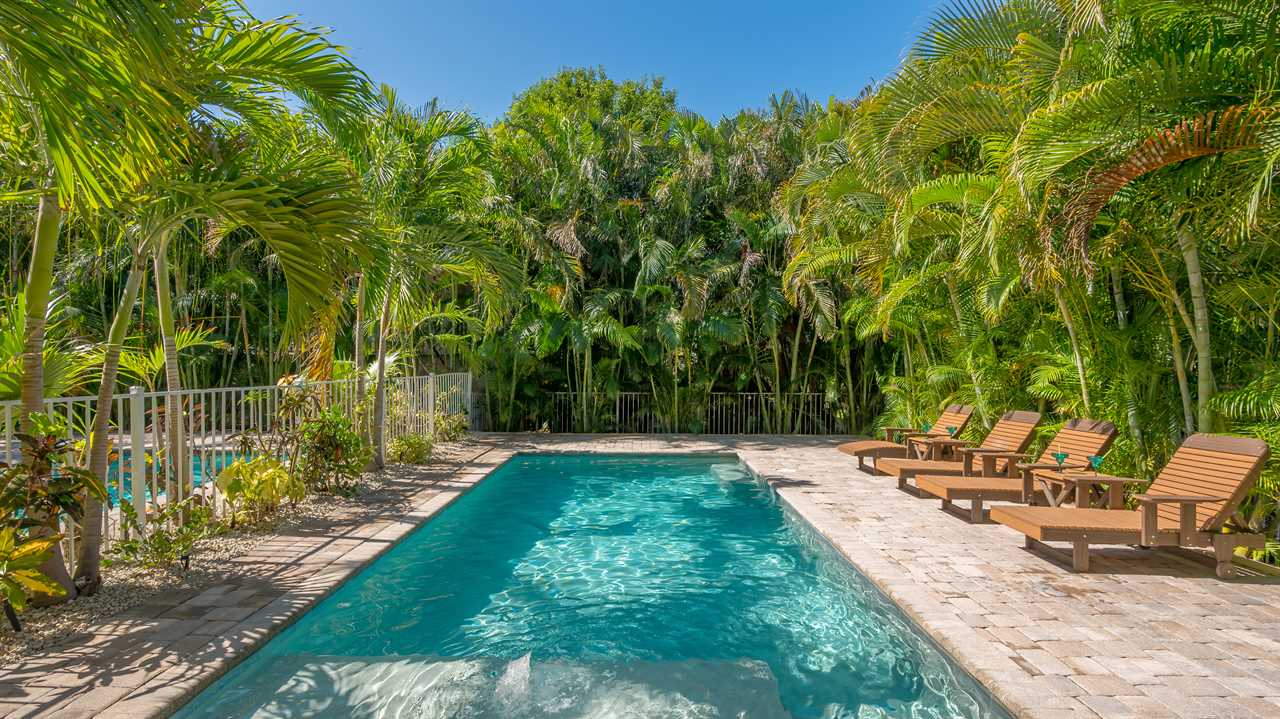You ascend to your third-floor sanctuary, where the ceilings stretch high and the sunlight spills in through wide windows. The scent of salt air drifts through the balcony doors as you sip morning coffee above the palms. After a beach walk at Point of Rocks, your private pool and shaded cabana wait below. As the sky turns to coral at dusk, the kitchen becomes the hub for evening cooking, conversation, and laughter—all while your dog dozes nearby, completely at home.