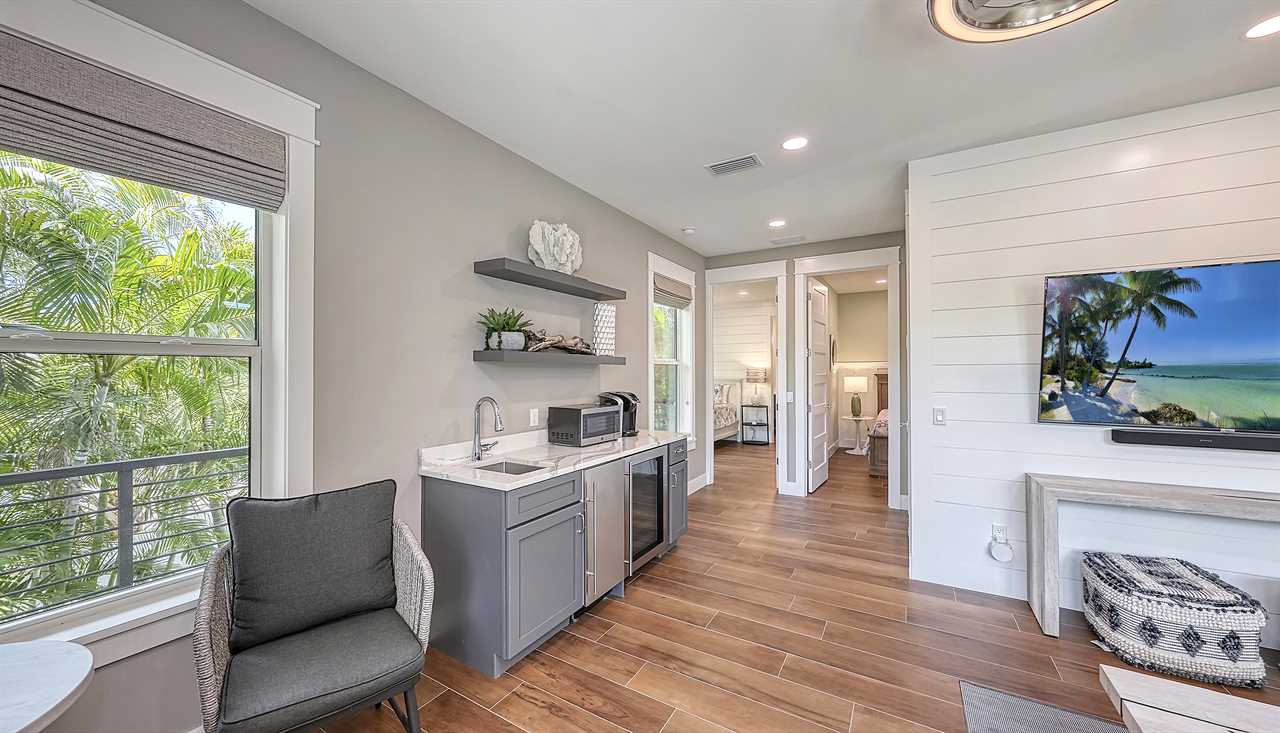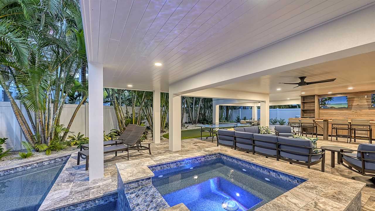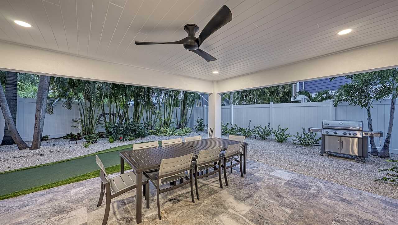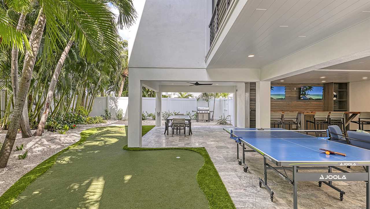 You step onto the balcony, coffee in hand, as morning light dances across the palm-lined backyard. Below, the pool sparkles and the waterfall hums softly—this is your sanctuary. Afternoons unfold on the putting green, with laughter drifting from the ping pong table. Evenings bring cocktails at the wet bar, dinner around the oversized kitchen island, and a sunset stroll—just a 2-minute walk to Siesta Key Beach. Here, every floor offers space, serenity, and coastal luxury.
