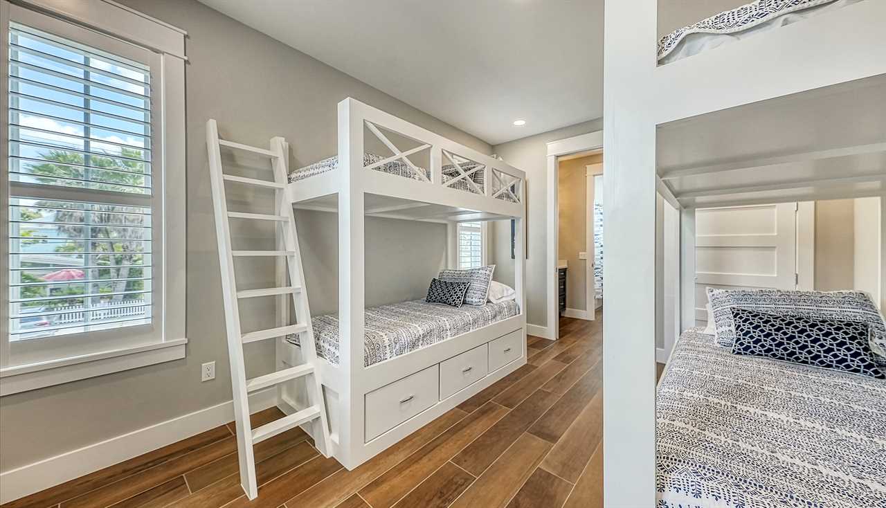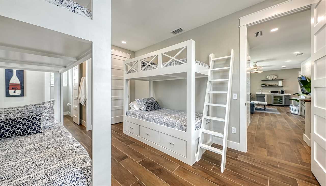 - Bedroom 7: Two Twin Bunk Beds (4 Twins), Shared Bath (Jack & Jill), Second Floor, TV