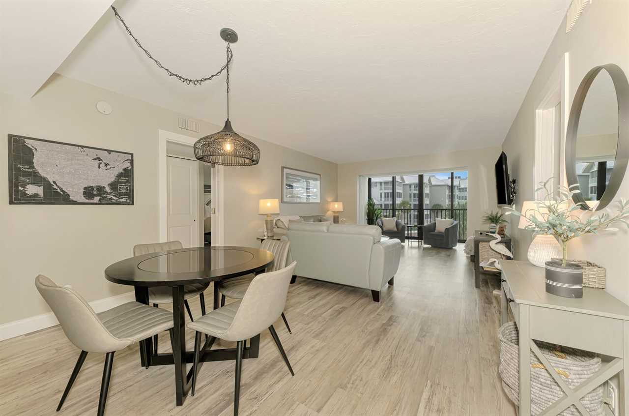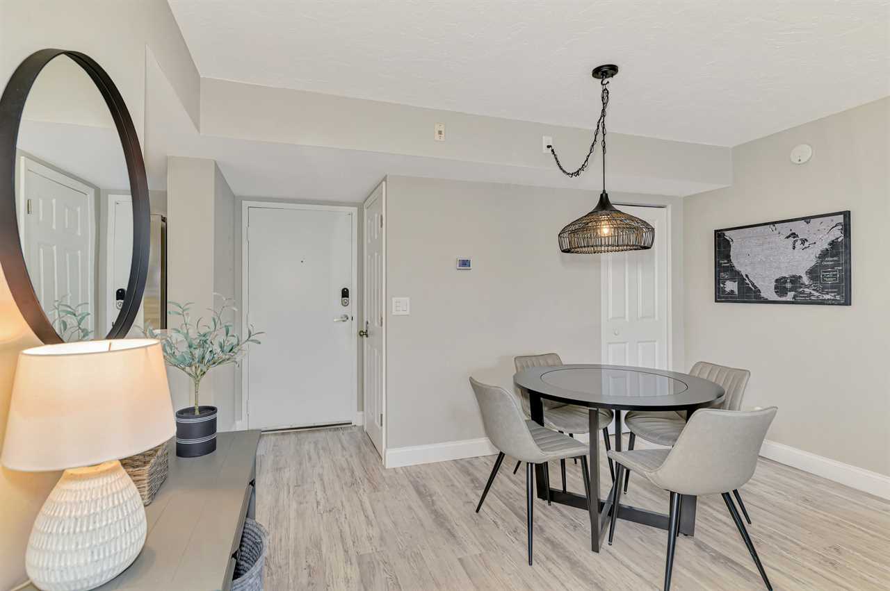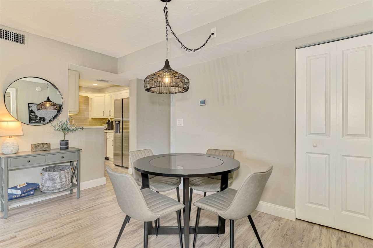 Granite kitchen countertop with all new stainless steel appliances. The kitchen comes fully equipped, including a Keurig for your morning coffee. Condo comes equipped with all dishes, cups, coffee mugs, utensils, pots, pans, and a toaster. Near the kitchen is the dining room, which includes a round dining table for 4.