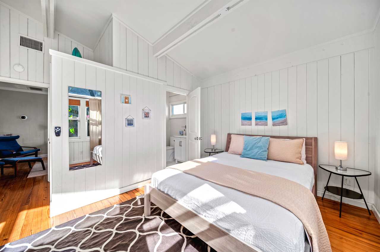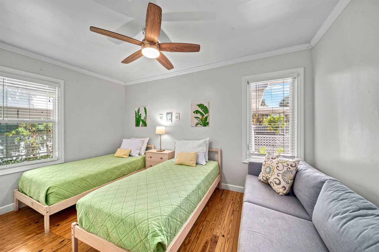 Inside Coconut House, sunlight fills the open kitchen as you prepare lunch for the group. Meanwhile, a friend naps in the sunny bedroom upstairs at Palm Shade Cottage, enjoying the privacy of a separate retreat.