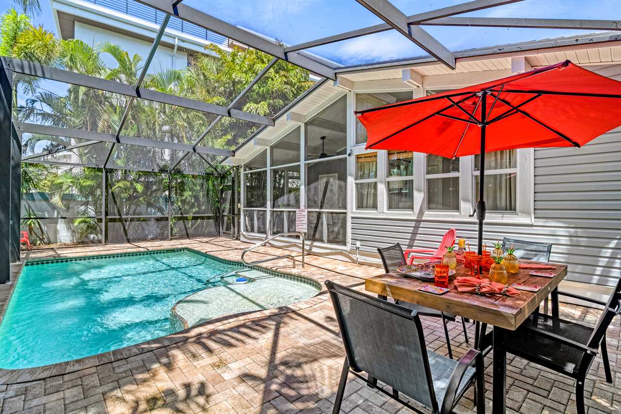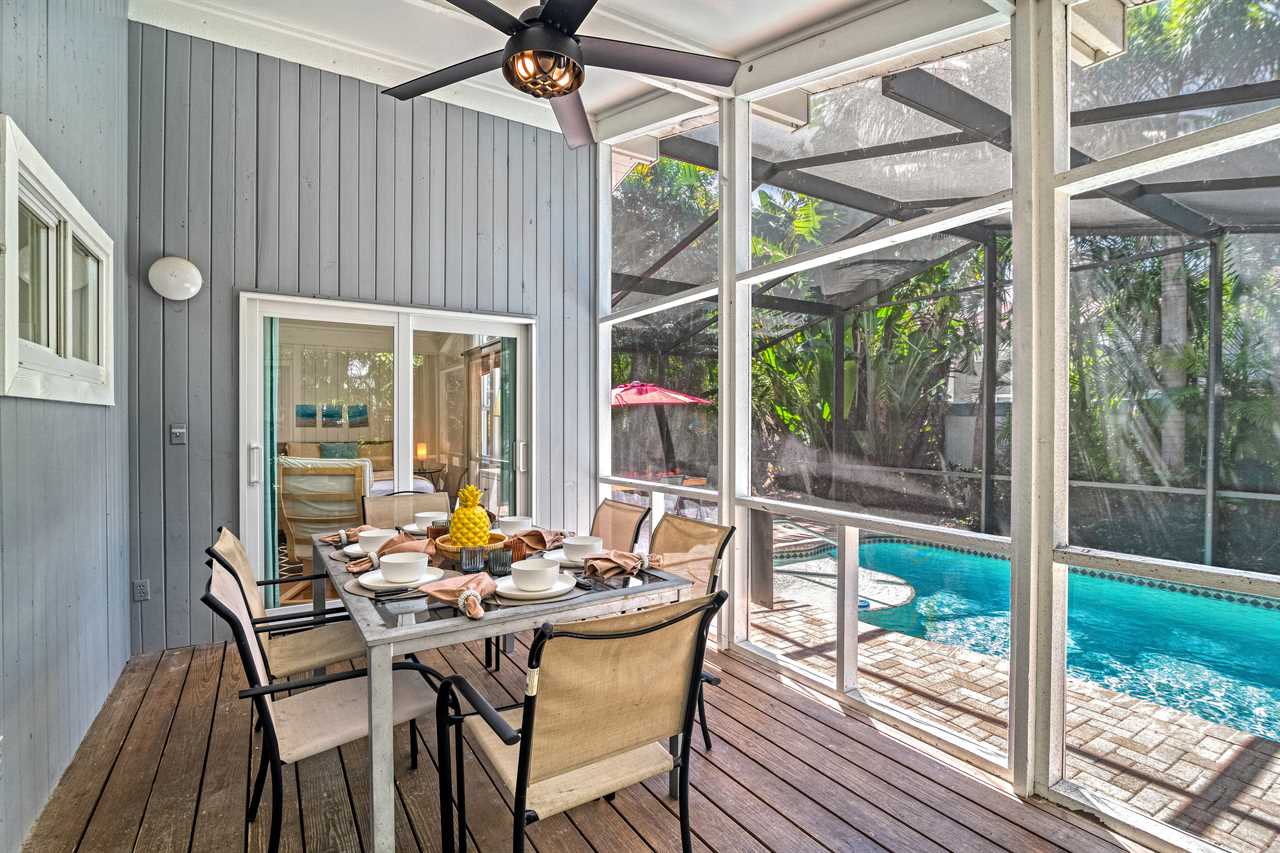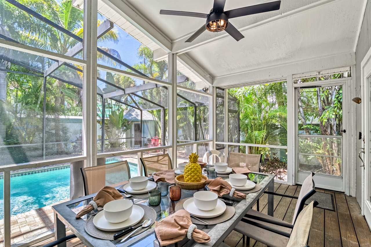 Two charming cottages, one unforgettable escape—Tropical Retreat brings together private indoor space and outdoor serenity just one block from Siesta Key Beach. With a screened-in heated pool, BBQ area, and alfresco dining, your group can unwind in complete exclusivity just steps from white sands and turquoise waters.